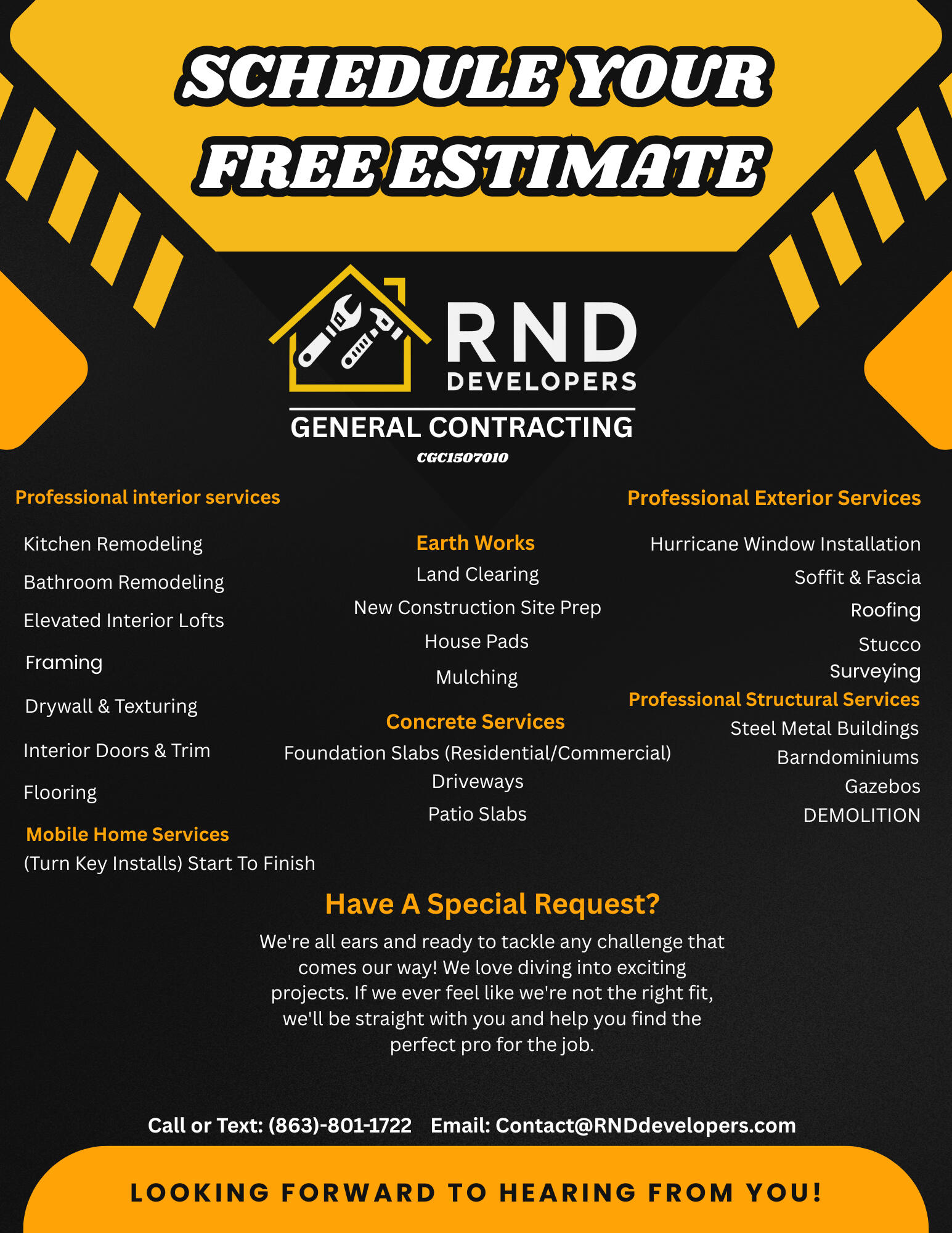 Build With Confidence. Build With RND.At RND Developers, we’re more than just a construction company—we’re licensed general contractors and your local partners in bringing any project to life. From small home repairs and remodels to complete turnkey residential homes and commercial buildings, we deliver results you can trust.Being local means we understand the community, the land, and the people we build for. Our reputation is built on trust, reliability, and lasting relationships. We treat every project as if it were our own, because we know our work isn’t just about structures—it’s about your family, your business, and your future.We handle it all:* Home Renovations & Remodeling – kitchens, bathrooms, additions, and full home transformations.